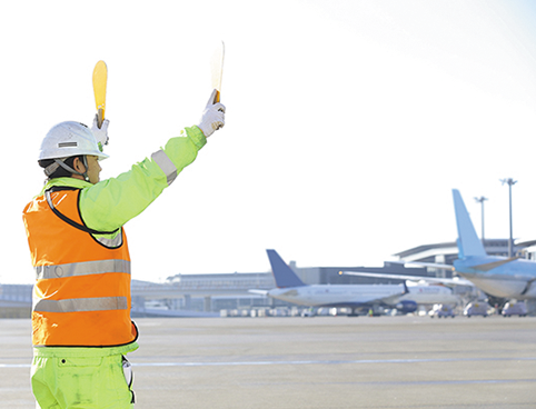 パドルを使って決められた動きでパイロットに指示を出し航空機を安全に停止位置まで誘導します。停止位置は機種ごとに決まっていて、ボーディング・ブリッジ(搭乗橋)を適切に接続するために正確さが求められます。