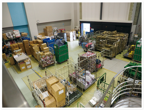 飛行機に搭載する、機内でサービスする販売品、シートポケットに入っている機内誌や安全のしおり、イヤホンなどを運航便ごとに準備するスタッフです。ここで準備した機内用品は、機内清掃スタッフに引き継がれます。
