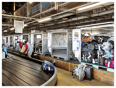 航空機から取り降ろした手荷物をベルトコンベアーに載せて、お客様の手荷物受取場へ流す作業です。様々な大きさ・重さ、貴重品や割れ物が入っている手荷物を、お客様が引き取りやすいような向きになるよう丁寧に載せていきます。