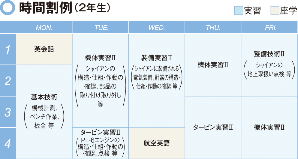 • 二等航空運航整備士は、『基本技術Ⅰ』を身につけることを求められていますが、成田国際航空専門学校では『基本技術Ⅱ』の指定です。よりレベルの高い『基本技術Ⅱ』を学び資格取得する事で大型機に必要な一等航空整備士の取得に有利になります。