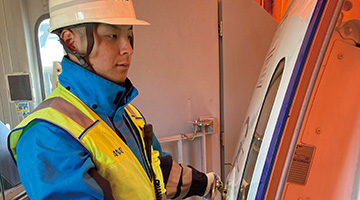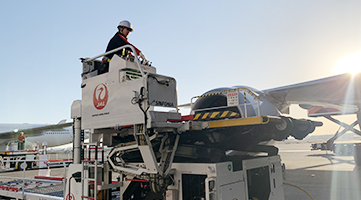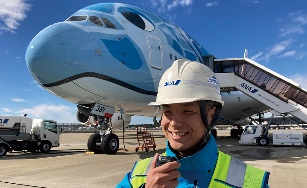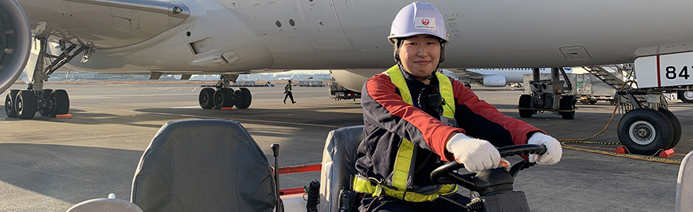 今は羽田空港国際線ターミナルのランプで搭降載の業務に携わっています。具体的には、貨物や郵便、手荷物の搭降載と搬送、自走器材の運転などです。自走器材の運転では操作技術を磨くため、終業後に練習することもあります。この仕事でいつも感動するのはセンダー業務(お客様を送り出す)の時です。機内のお 客様がこちらに気づいて手を振り返してくれた時は嬉しくなります。また、同じ航空機でも日々搭載物や特性も異なるため、毎日が勉強。チームで1便を完了させ離陸した後の達成感に、やりがいと魅力を感じています。