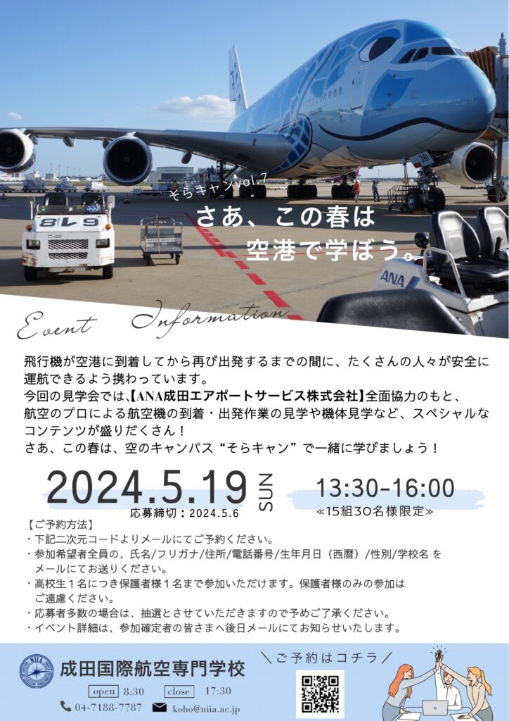 キャンパスニュース ホーム キャンパスニュース一覧 大人気の空港見学イベント”そらキャン”第7弾開催決定! 2024.4.12 NIIA 大人気の空港見学イベント”そらキャン”第7弾開催決定! オープンキャンパスは行ってみたものの、『実際に航空業界のことよくわからない・・・航空業界について知識が欲しい!』そんな新高校1,2,3年生&保護者の皆さまへ、大人気の空港見学イベント’“そらキャン”を本年も開催決定!普段絶対に立ち入ることのできない空港の裏側へ皆様を無料でご招待! さあ、この春は空のキャンパス”そらキャン”で一緒に学びましょう! ご予約はこちらから▷ koho@niia.ac.jp < PREV 一覧へ戻る NEXT >